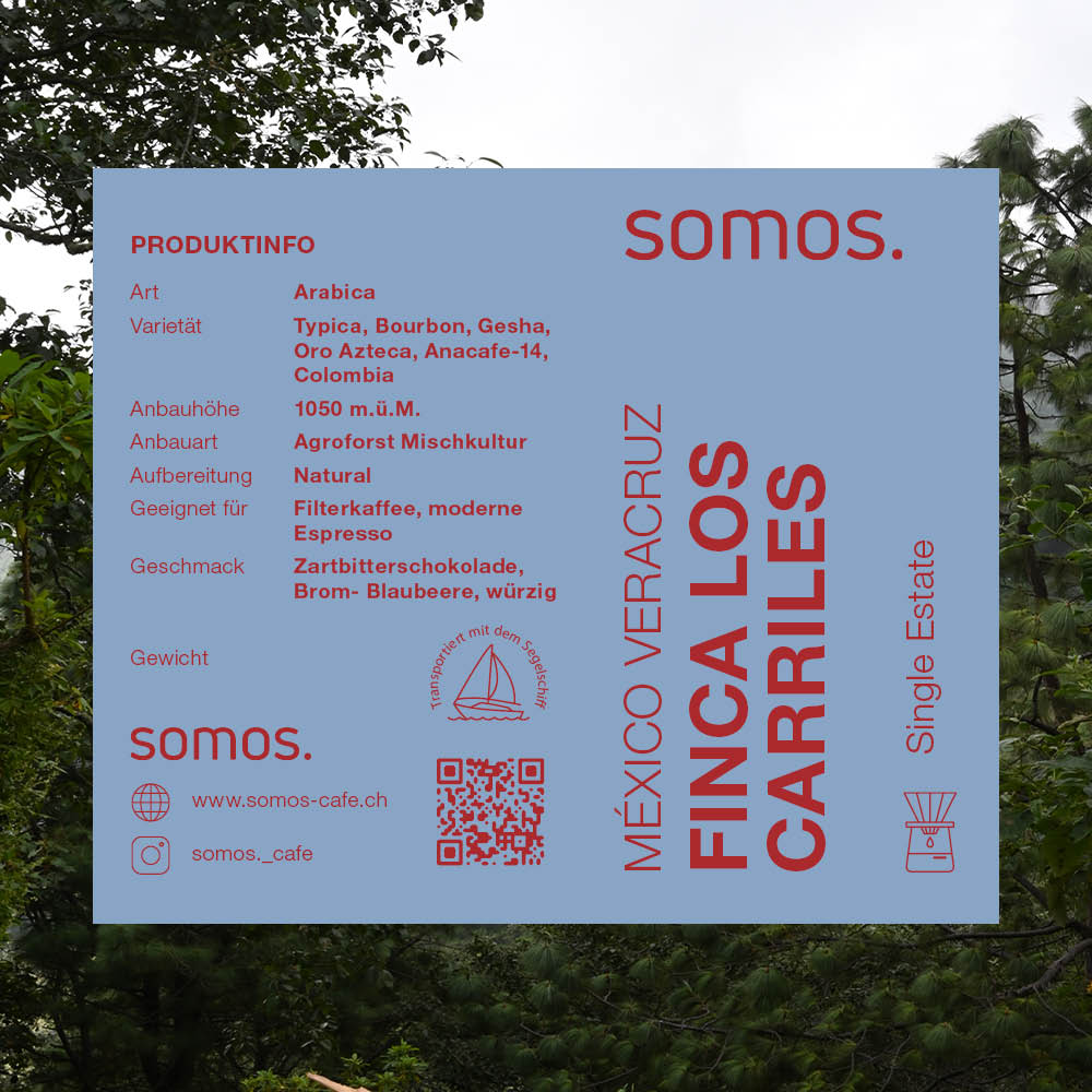 Mit dem Kaffee der Finca Los Carriles, ein Familienbetrieb in der Ortschaft Tlapala im Verwaltungsbezirk Totutla, erweitert sich die Produktpalette um einen wunderschönen Kaffee. Die Anbaubedingungen stützen sich auf biodiverse Agroforstwirtschaft und Silvino bewirtschaftet seine Felder aus Überzeugung biologisch. Der Kaffee wächst auf der Finca Los Carriles demnach unter Wald ähnlichen Bedingungen, in Kombination mit anderen Nutzpflanzen und im Einklang mit der Natur. Das Ziel der Familie ist es, die Biodiversität sowie das Wasser und den Boden zu schützen, um den zukünftigen Generation die Möglichkeit einer naturnahen und intakten Landwirtschaft möglich zu machen. Uns freut eine solche Haltung extrem, wichtiger als eine Zertifizierung auf der Verpackung ist für uns die Überzeugung der Menschen hinter einem Produkt. Die Varietäten die Silvino anbaut sind Typica, Bourbon, Geisha, Anacafe-14, Oro Azteca und Colombia. Die Varietäten sind zum Teil solche, die sich an die dortige Region angepasst haben oder gezielt gepflanzt wurden, um zukünftig gute Ernten zu ermöglichen. Der Kaffee wird nach sorgfältiger Ernte trocken aufbereitet und in der Sonne getrocknet.