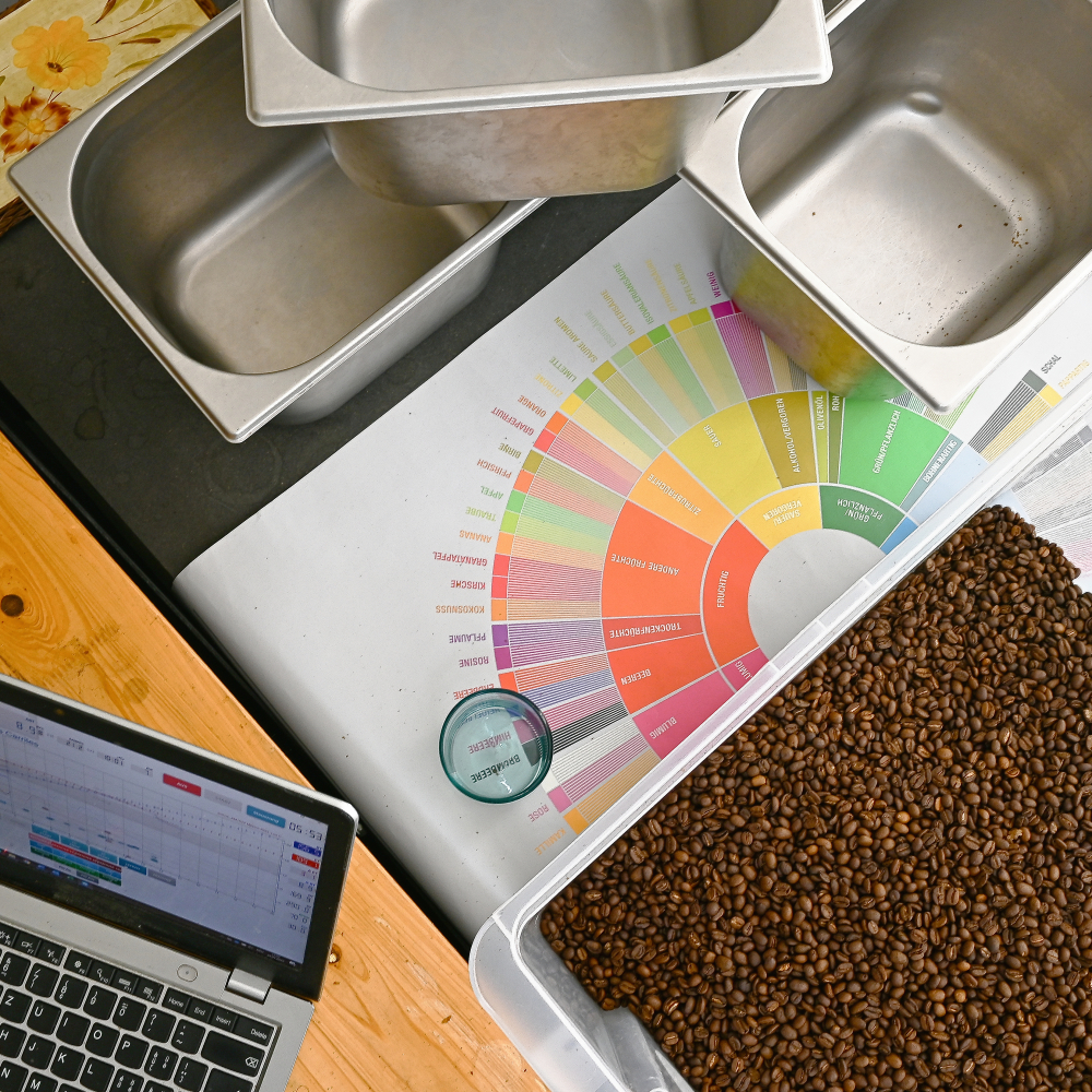 Nach den ersten Proberöstungen wird gewartet bis das CO2 einigermassen aus dem Kaffee entweicht ist und man den Kaffee entsprechend zubereiten kann. Danach wird fleissig gecupped, gebrüht und extrahiert. Stimmt der Geschmack oder will man den Kaffee etwas mehr rösten? Soll die Säure hervorgehoben werden indem man die Röstzeit verkürzt? Rösten ist oft tüfteln und entdecken, was ein Kaffee alles zu bieten hat. Gäbe es Maschinen die das alles im Vorhinein schon wissen, würde Rösten dann immer noch diese Magie über unsere Basler Quartiere legen?